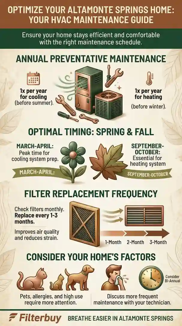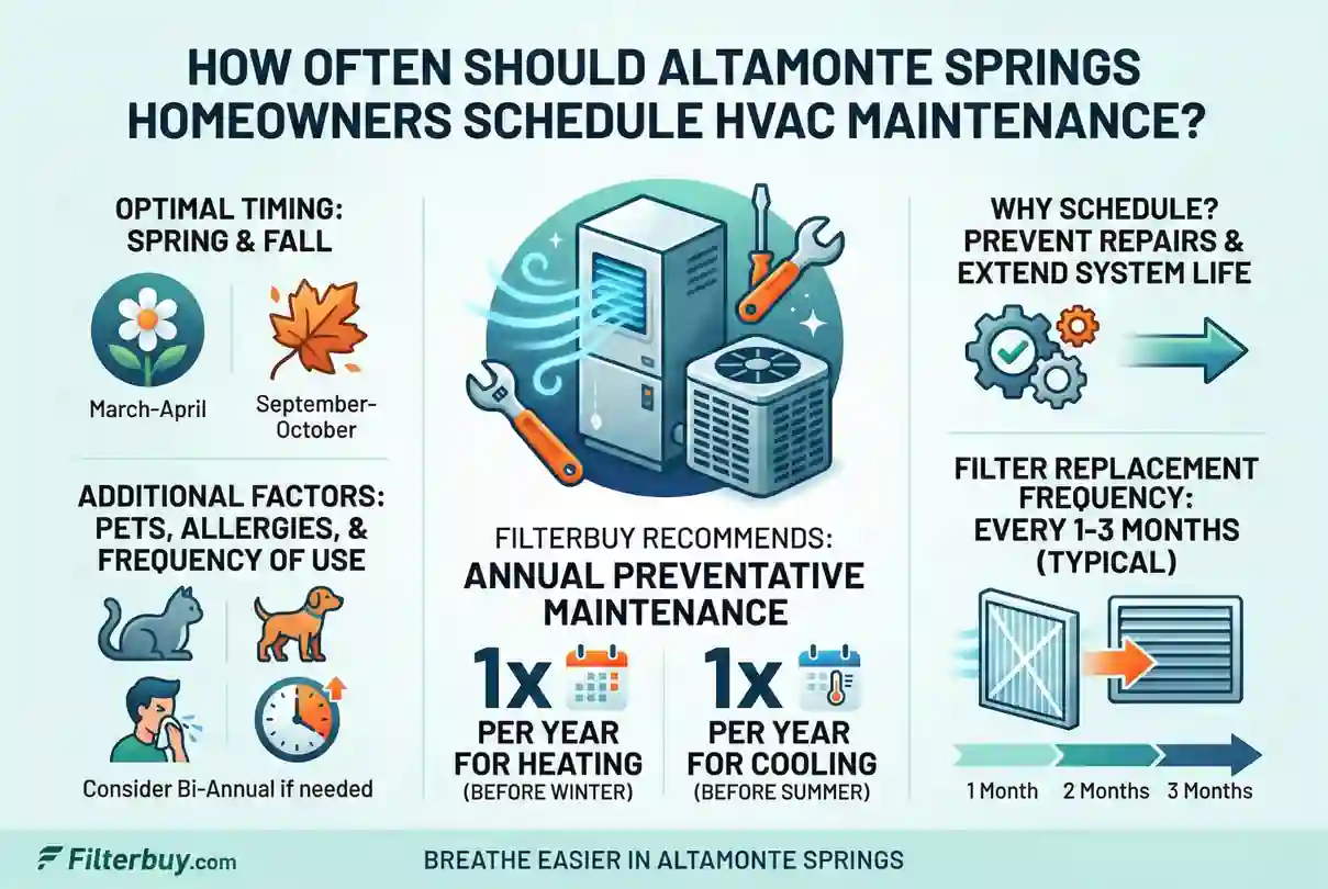 The baseline recommendation for Altamonte Springs homeowners is two professional HVAC maintenance visits annually — one in early spring (March or April) and one in early fall (October). Spring tune-ups prepare your cooling system before the brutal Central Florida heat arrives. Fall visits service the heating system and address any wear accumulated over the long cooling season before temperatures drop.